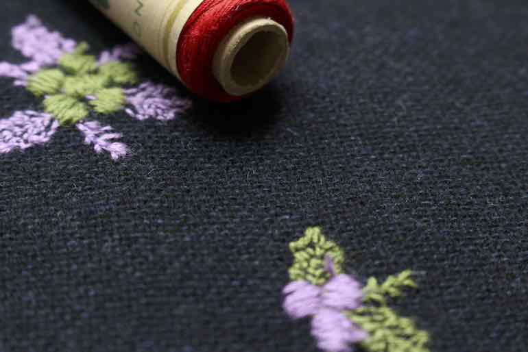 深いネイビーブルーの普通地のウール生地に、花柄の刺繍のファブリックです。