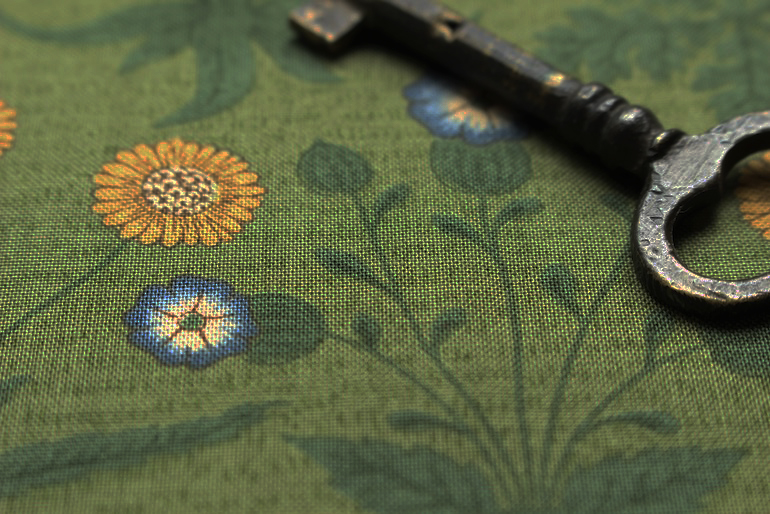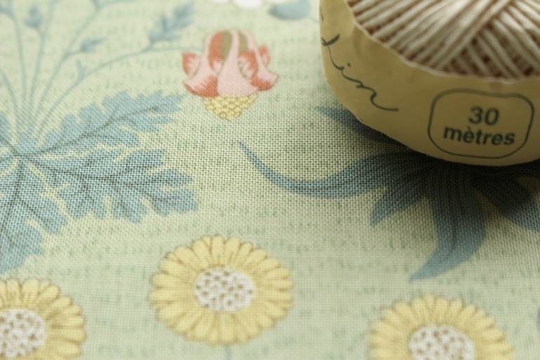 BEST OF MORRISのデイジー。1865-75年のデザインを柄送りを小さくした復刻です。手触りなめらかなコットン生地。ブラウス、ワンピースなどのお洋服、カーテン等のインテリア雑貨、バッグ類、パッチワーク小物等にもおすすめです。渋めのグリーン。デイジーの花で18mmぐらい。
