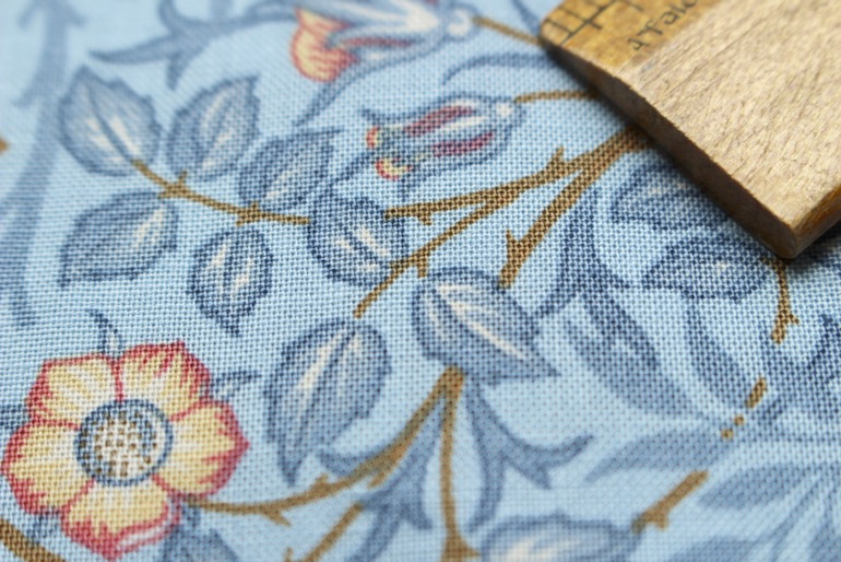 BEST OF MORRISの薔薇モチーフ。1908年のデザインの復刻です。手触りなめらかなコットン生地。ブラウス、ワンピースなどのお洋服、カーテン等のインテリア雑貨、バッグ類、パッチワーク小物等にもおすすめです。色は2色使い。渋めのブルー ベース。花の大きさは22mmぐらい。