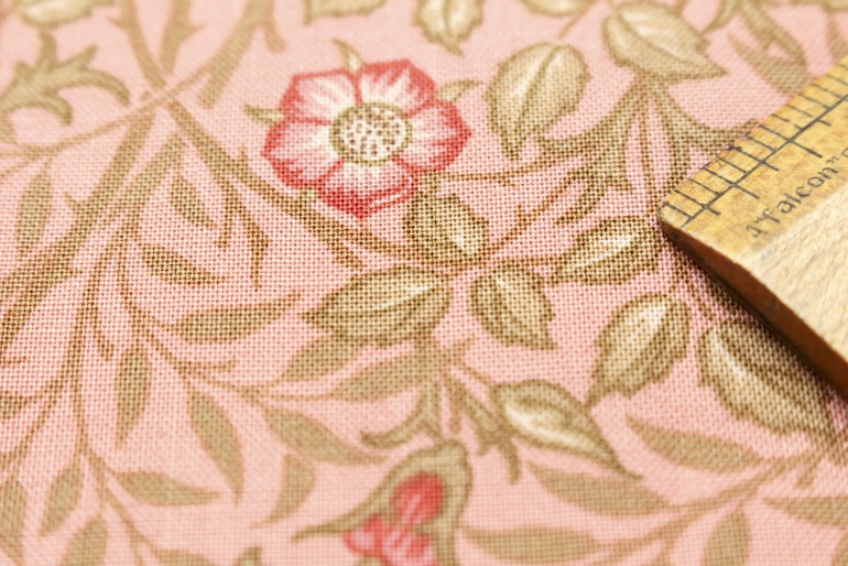 BEST OF MORRISのゼニアオイモチーフ。1879年のデザインの復刻です。手触りなめらかなコットン生地。ブラウス、ワンピースなどのお洋服、カーテン等のインテリア雑貨、バッグ類、パッチワーク小物等にもおすすめです。色は2色使い。渋めの赤。花の大きさは22mmぐらい。
