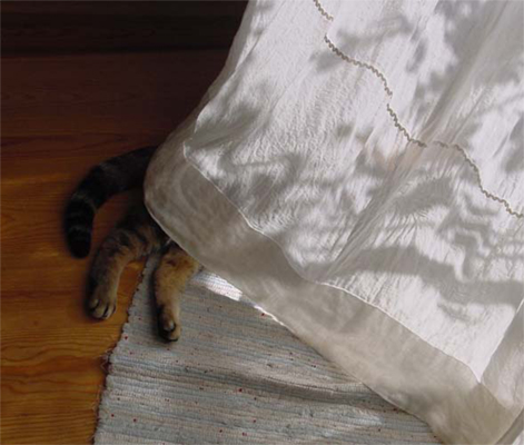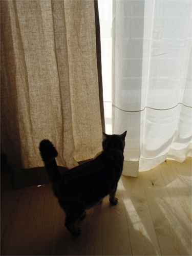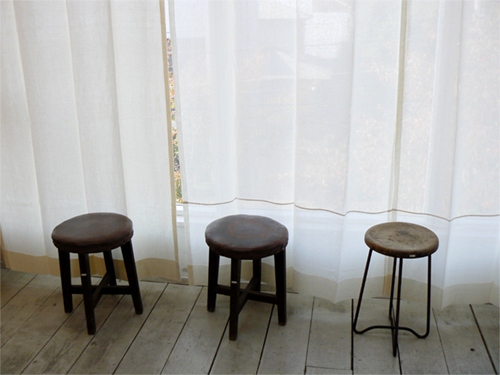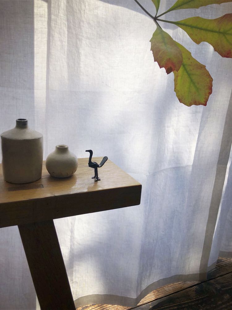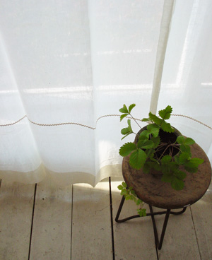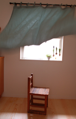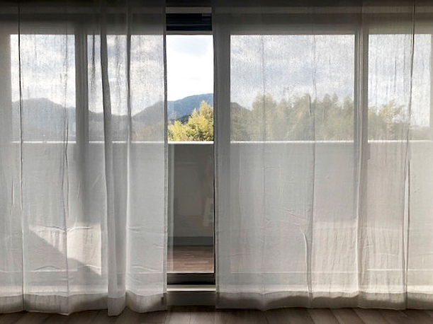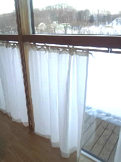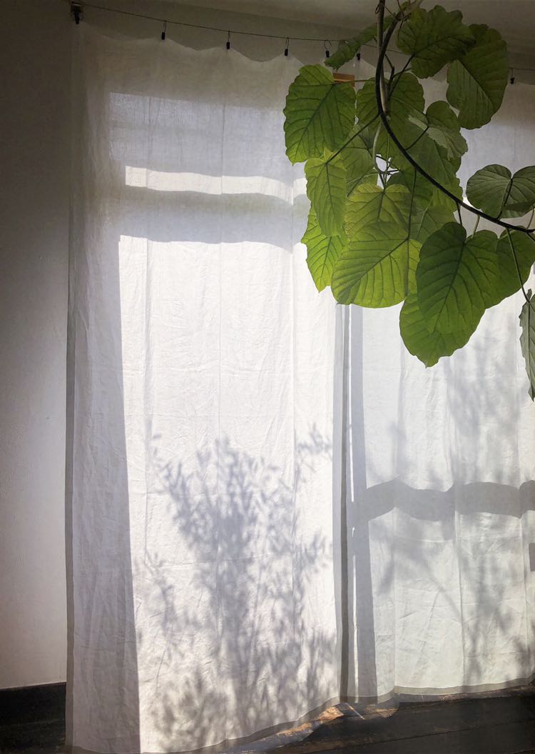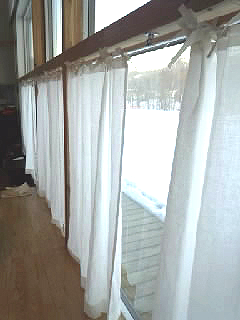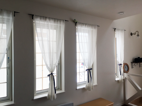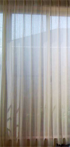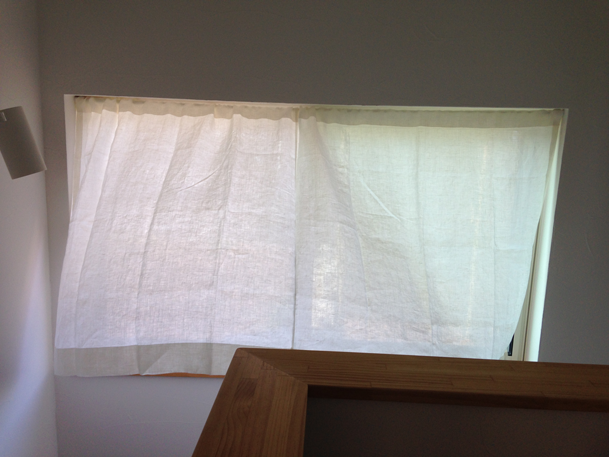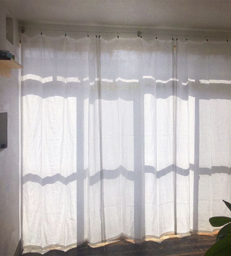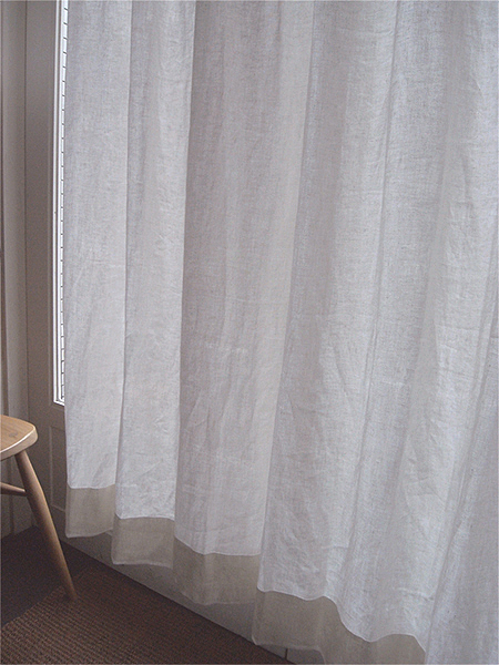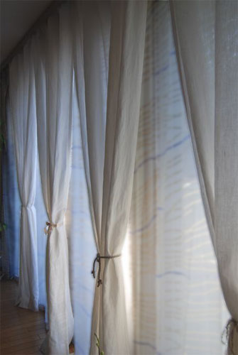 写真はリネットの北側の窓にかけて撮影。日がさすと外の様子がそっと判る感じの透け感です。ワイヤーに直接掛けています。