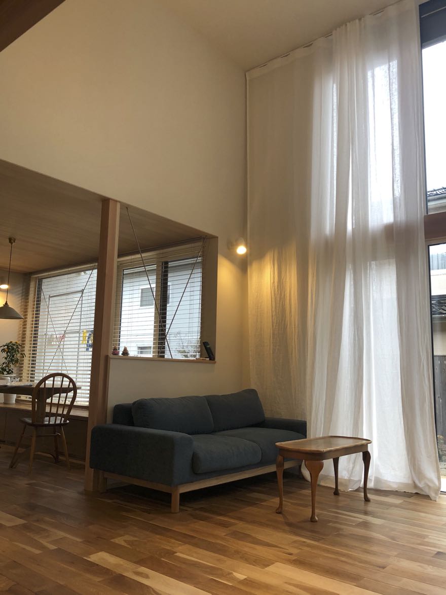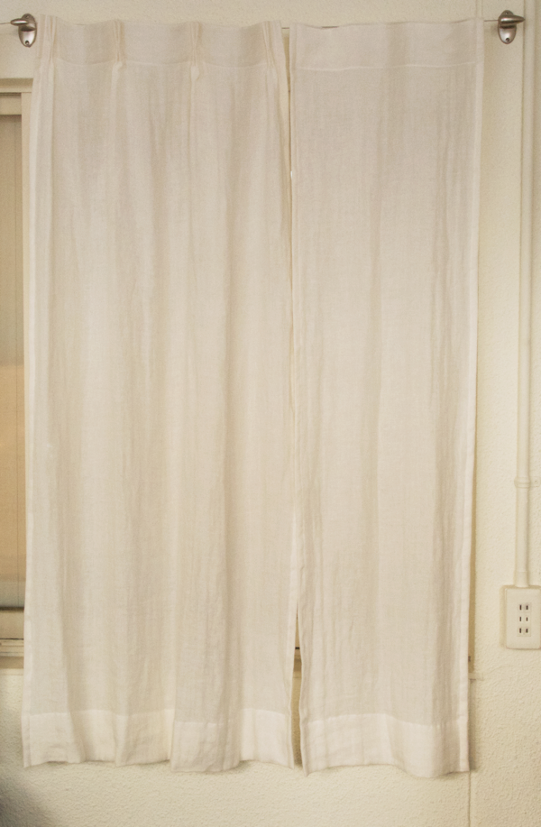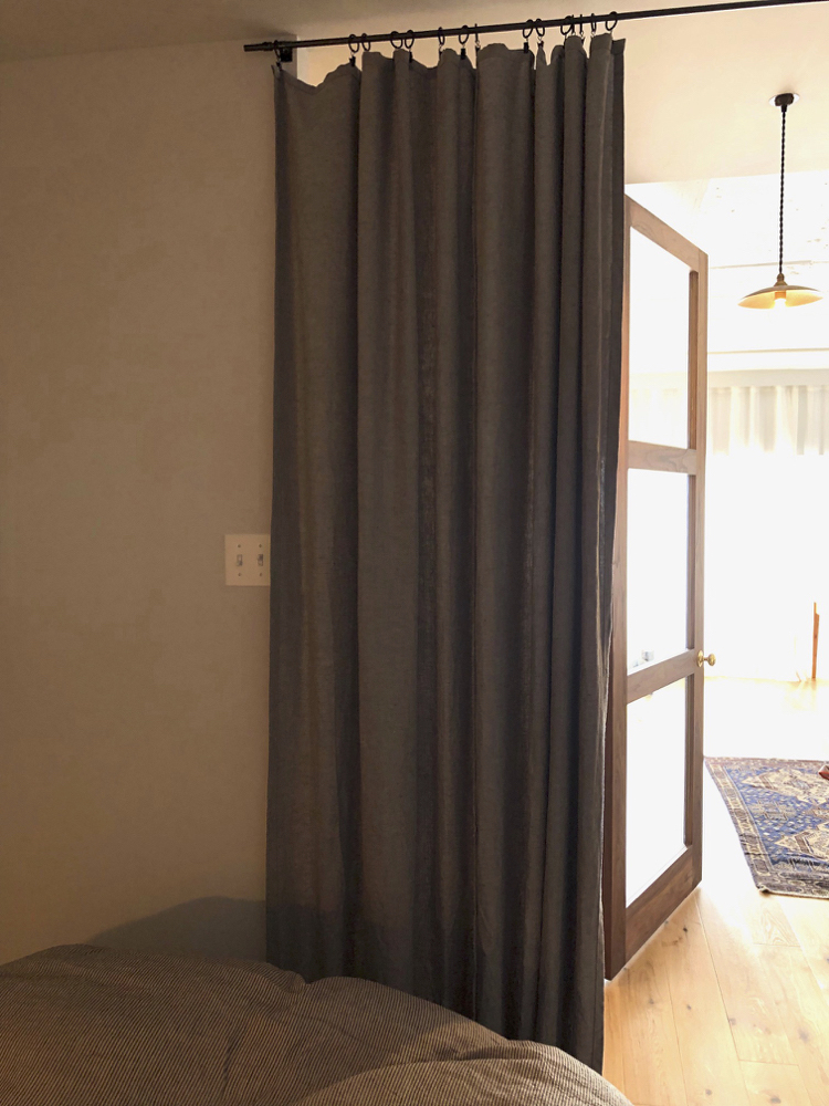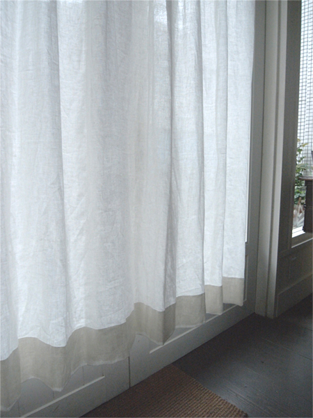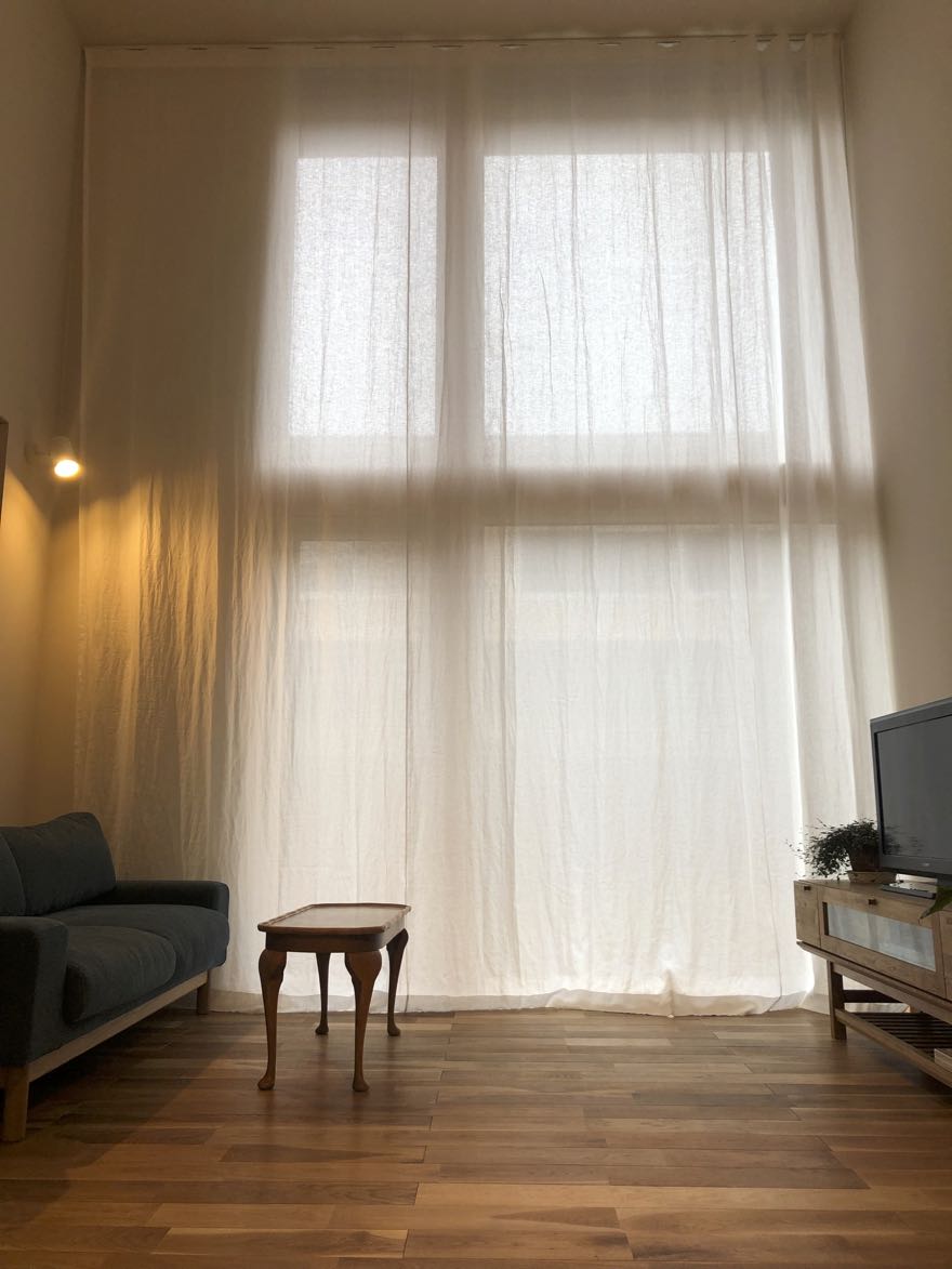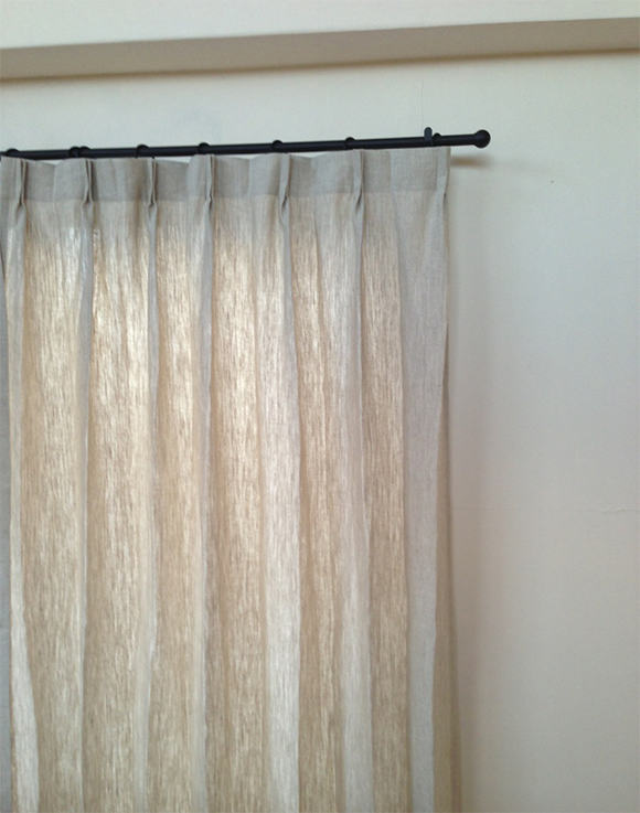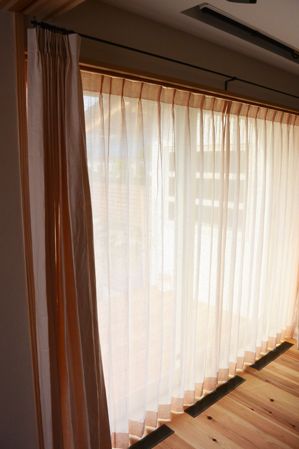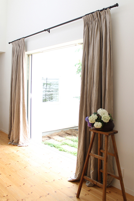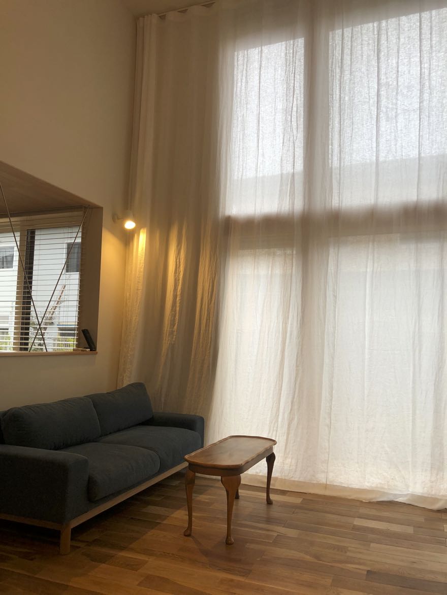 シンプルに、天井いっぱいから設置されたリネンのカーテン。プレーンの1.1倍でモダーンな空間とも程よい感じです。