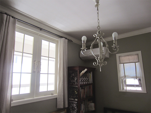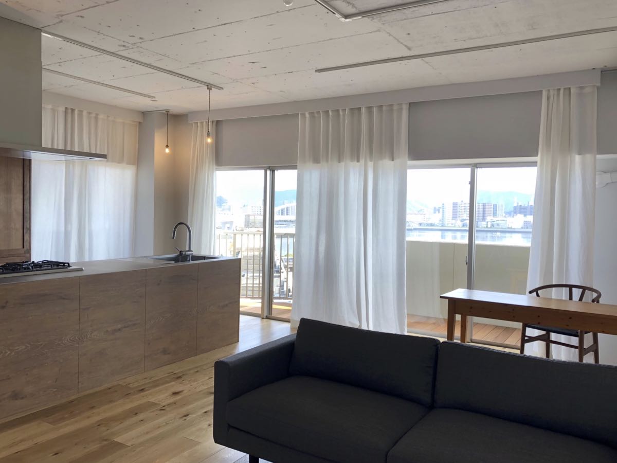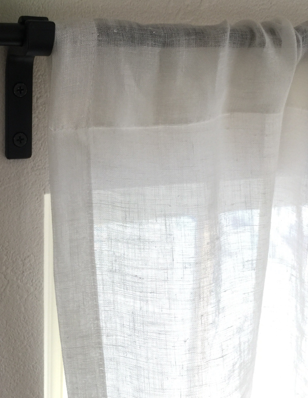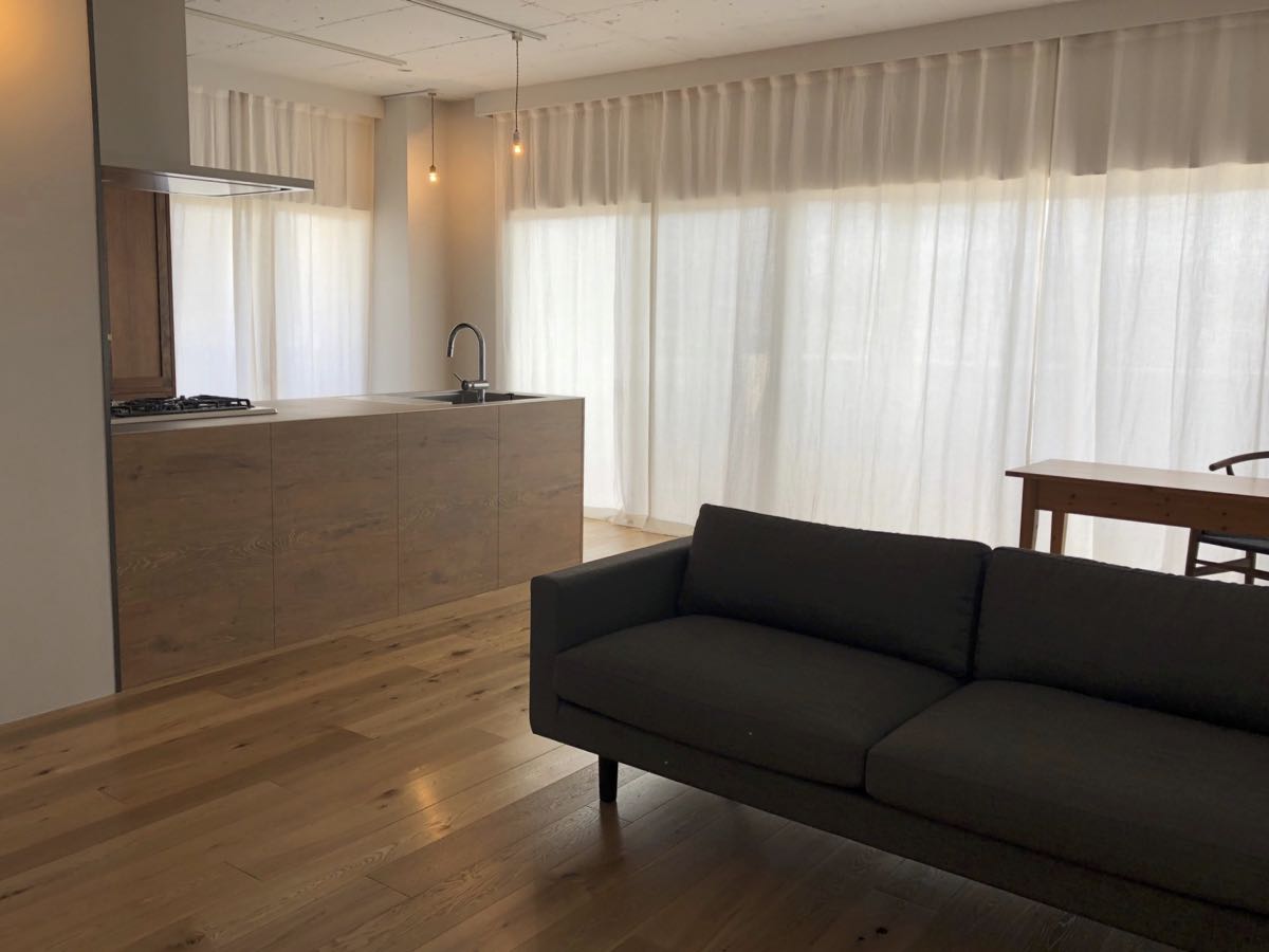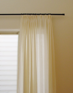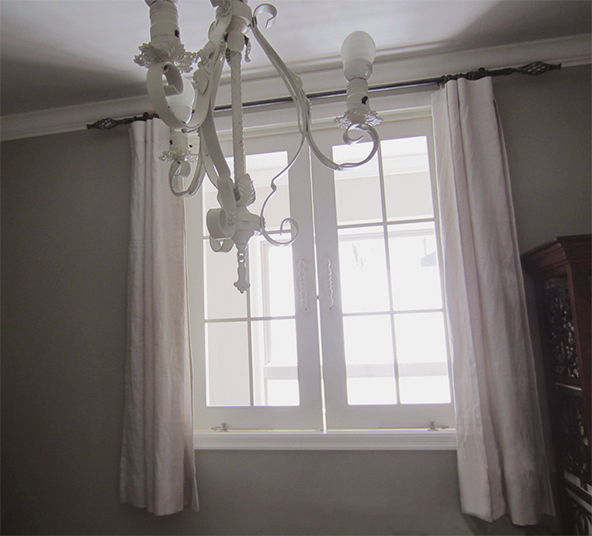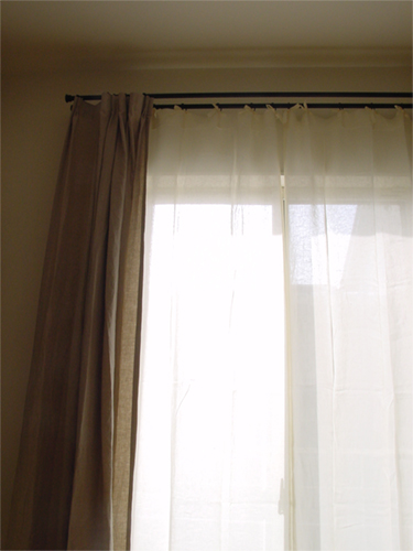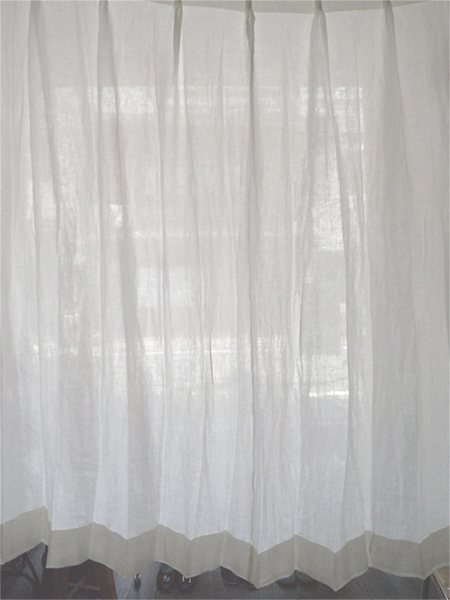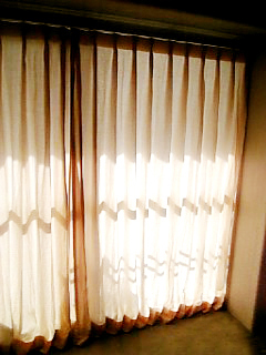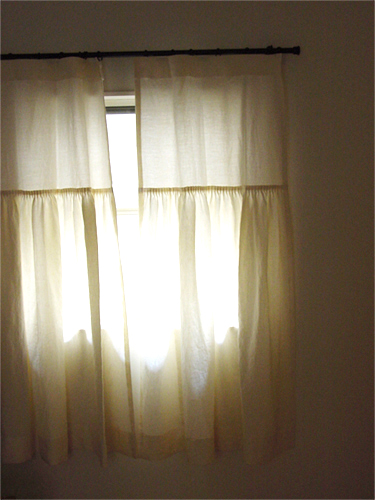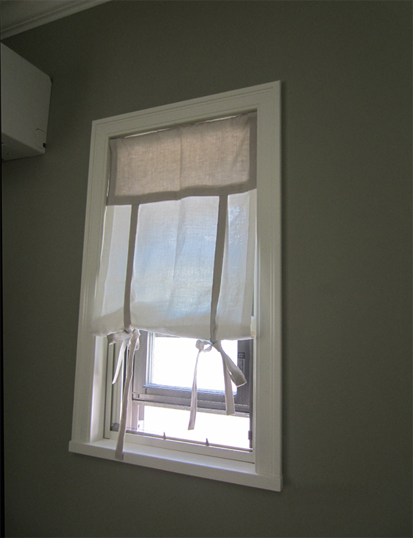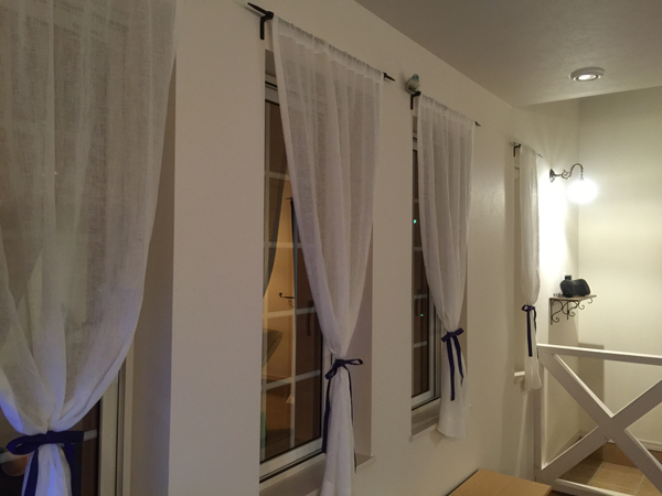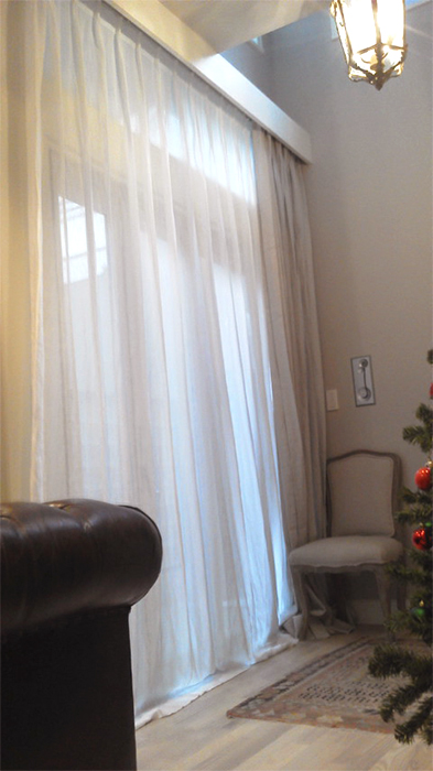 シンプルに、天井いっぱいから設置されたリネンのカーテン。プレーンの1.1倍でモダーンな空間とも程よい感じです。