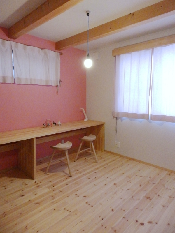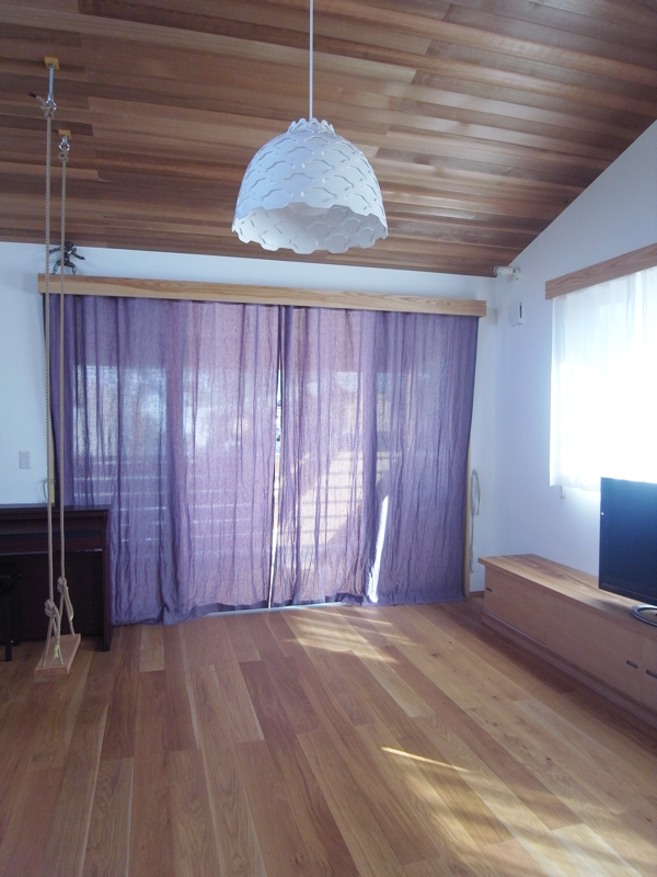 木垂木を表しにした、壁珪藻土クロス、床木フローリングのナチュラルな空間にリネンのカーテンが心地よいです。(Y邸)