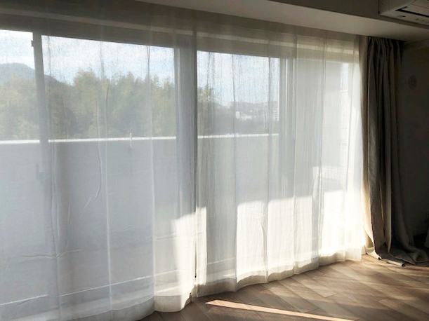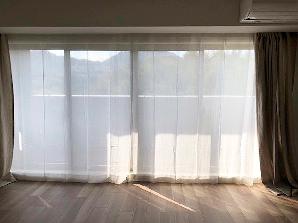 窓幅の約1.5倍、2ツ山で作ったリネンガーゼオフ白のカーテンです。ドレープはクラシックグラファイトでシックにまとめました。お日さまの光が柔らかい感じがします。