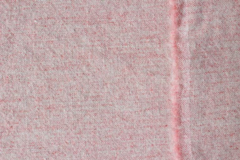 ドライな仕上がりの、リネンウールです。縦糸がリネンの生成り、緯糸のウールとの構成で、味わい深い杢調のローズレッドになりました。
