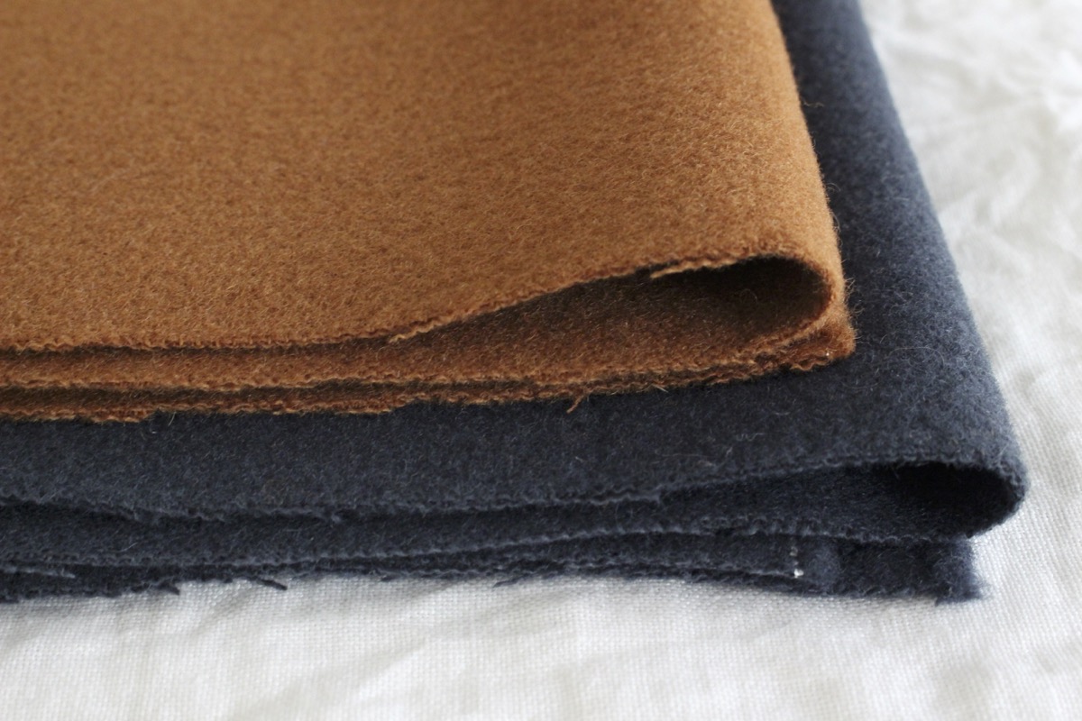 色が美しく、手触りの良いウール圧縮ニット。生地厚は厚すぎず、家庭用のミシンでも