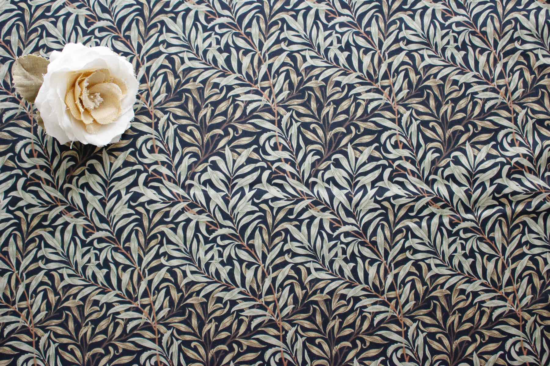 BEST OF MORRISのウイローボウ。生き生きとした柳の枝が描かれています。ブラウス、ワンピースなどのお洋服、カーテン等のインテリア雑貨、バッグ類、パッチワーク小物等にもおすすめです色は、ベースがネイビー、柄は淡いブルーとグリーン、アンティークな感じ。