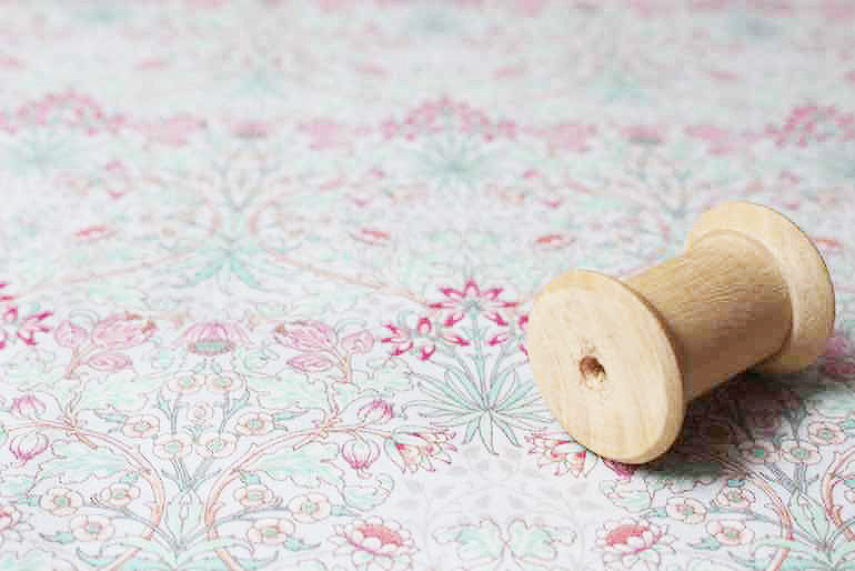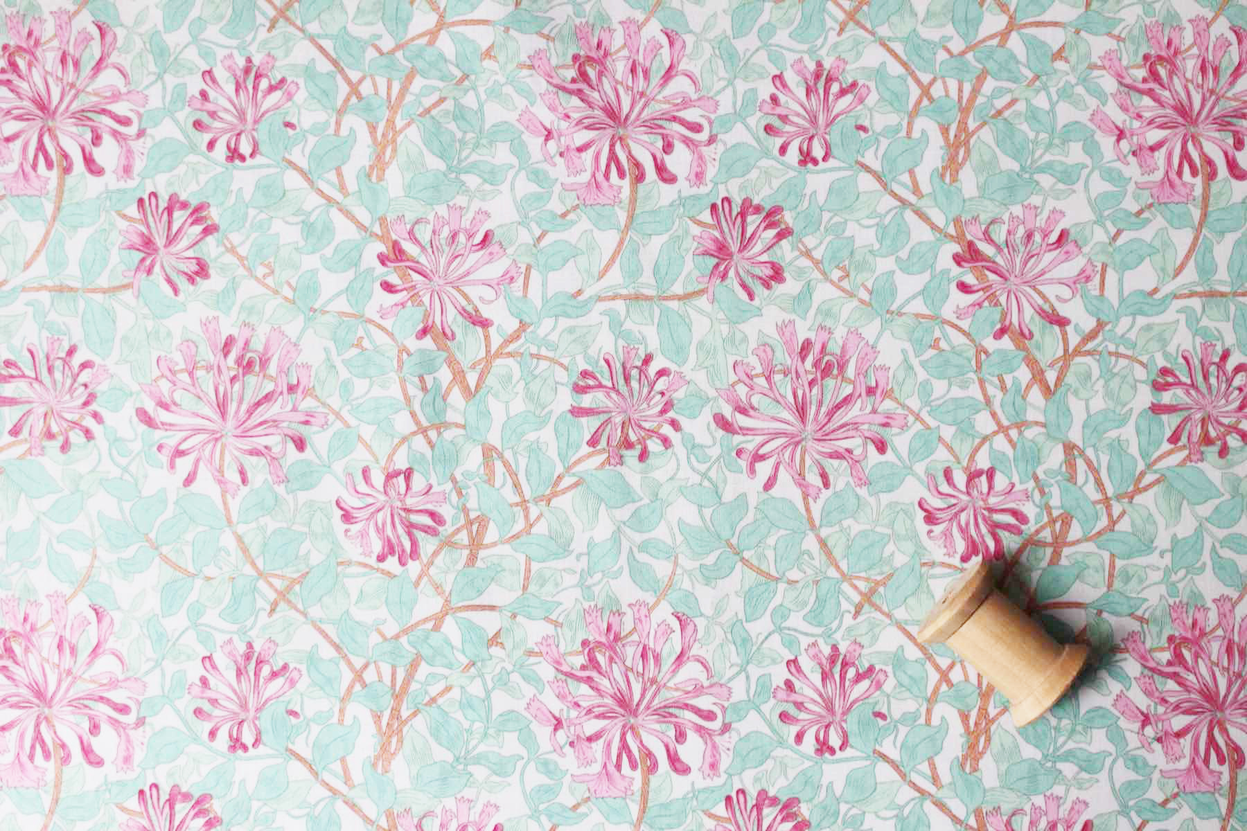 BEST OF MORRISのゼニアオイモチーフ。1879年のデザインの復刻です。手触りなめらかなコットン生地。ブラウス、ワンピースなどのお洋服、カーテン等のインテリア雑貨、バッグ類、パッチワーク小物等にもおすすめです。色は2色使い。渋めの赤。花の大きさは22mmぐらい。