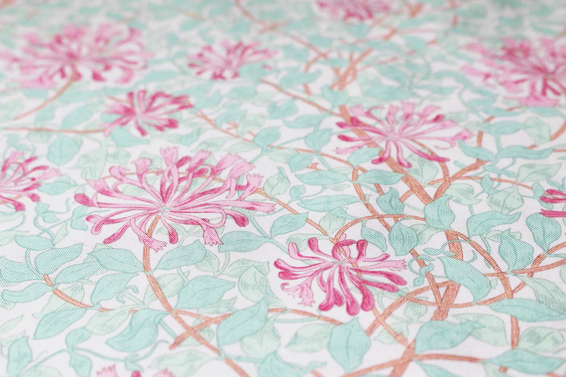 1908年のデザインの復刻です。手触りなめらかなコットン生地。ブラウス、ワンピースなどのお洋服、カーテン等のインテリア雑貨、バッグ類、パッチワーク小物等にもおすすめです。花の大きさは10mmぐらい。