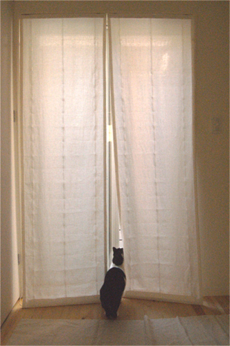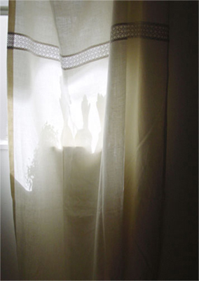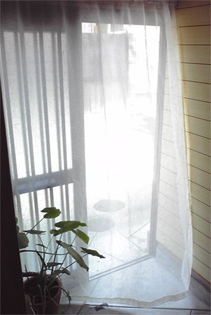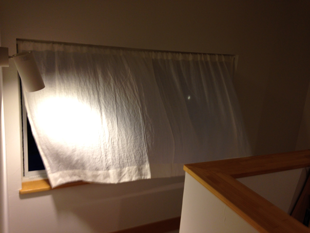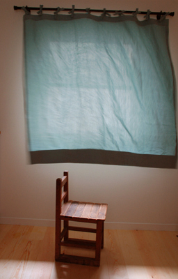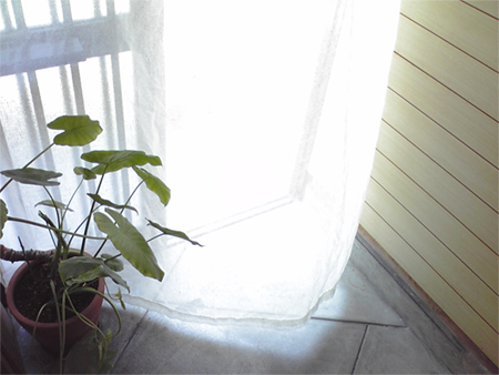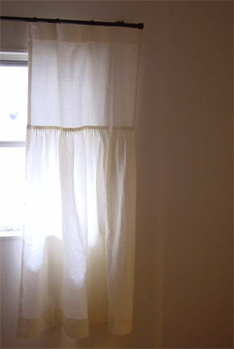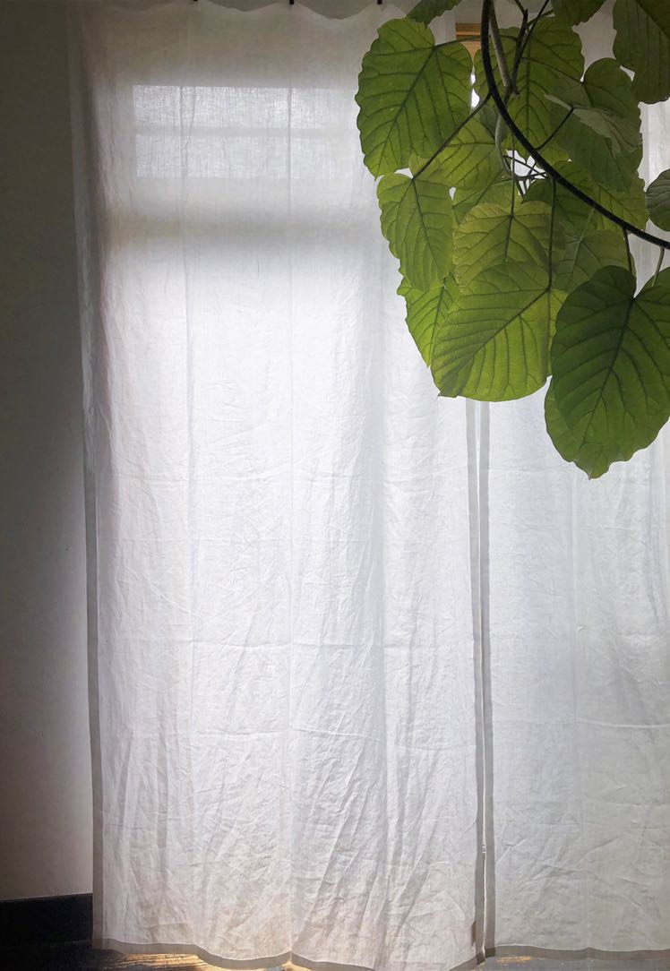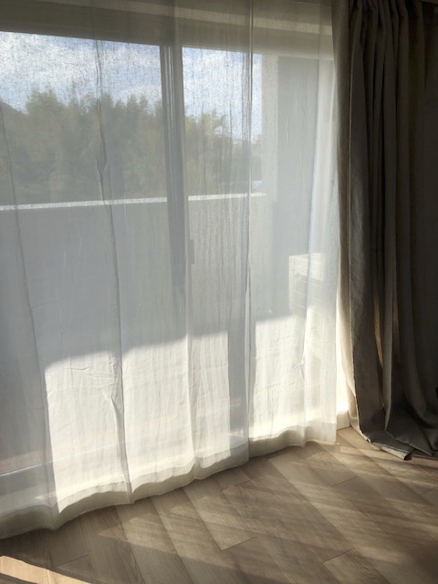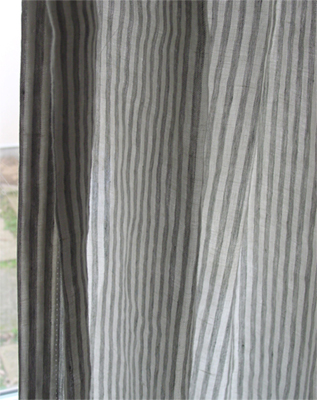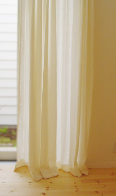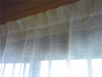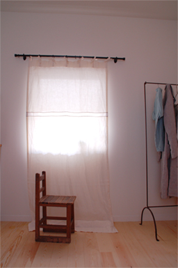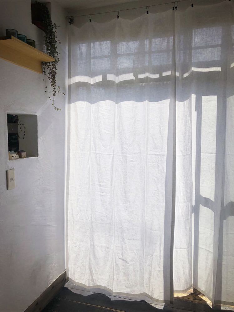 写真はリネットの北側の窓にかけて撮影。日がさすと外の様子がそっと判る感じの透け感です。ワイヤーに直接掛けています。
