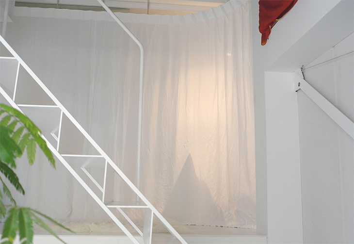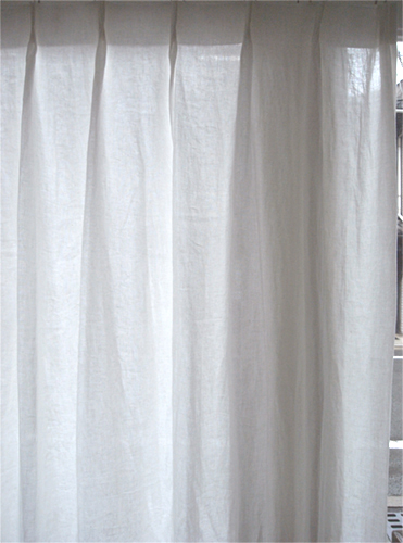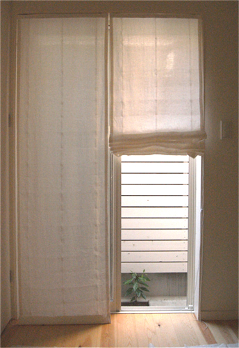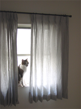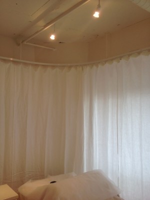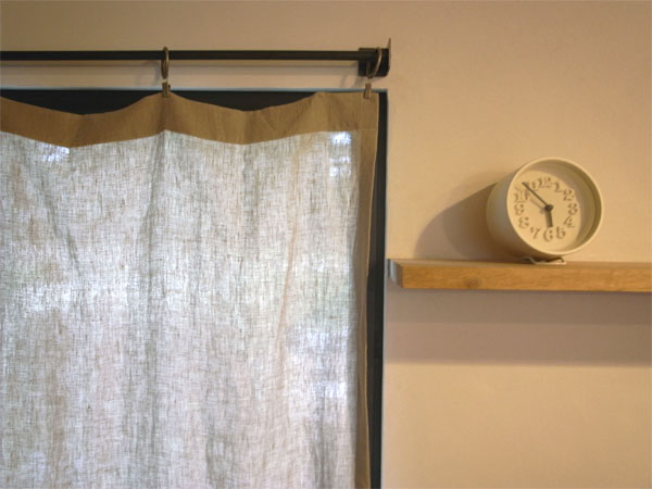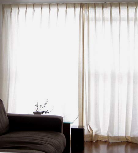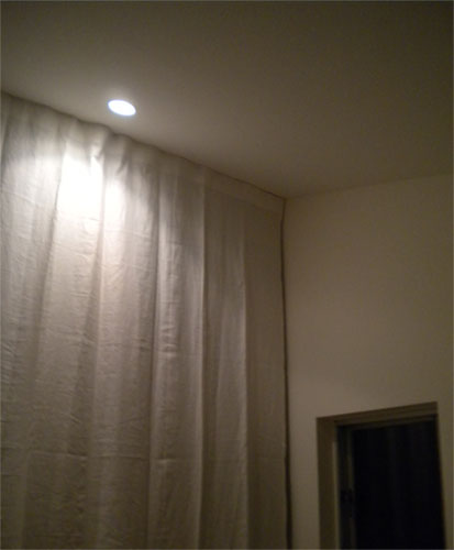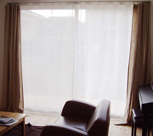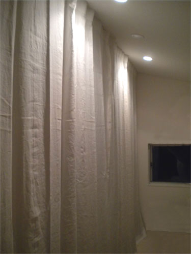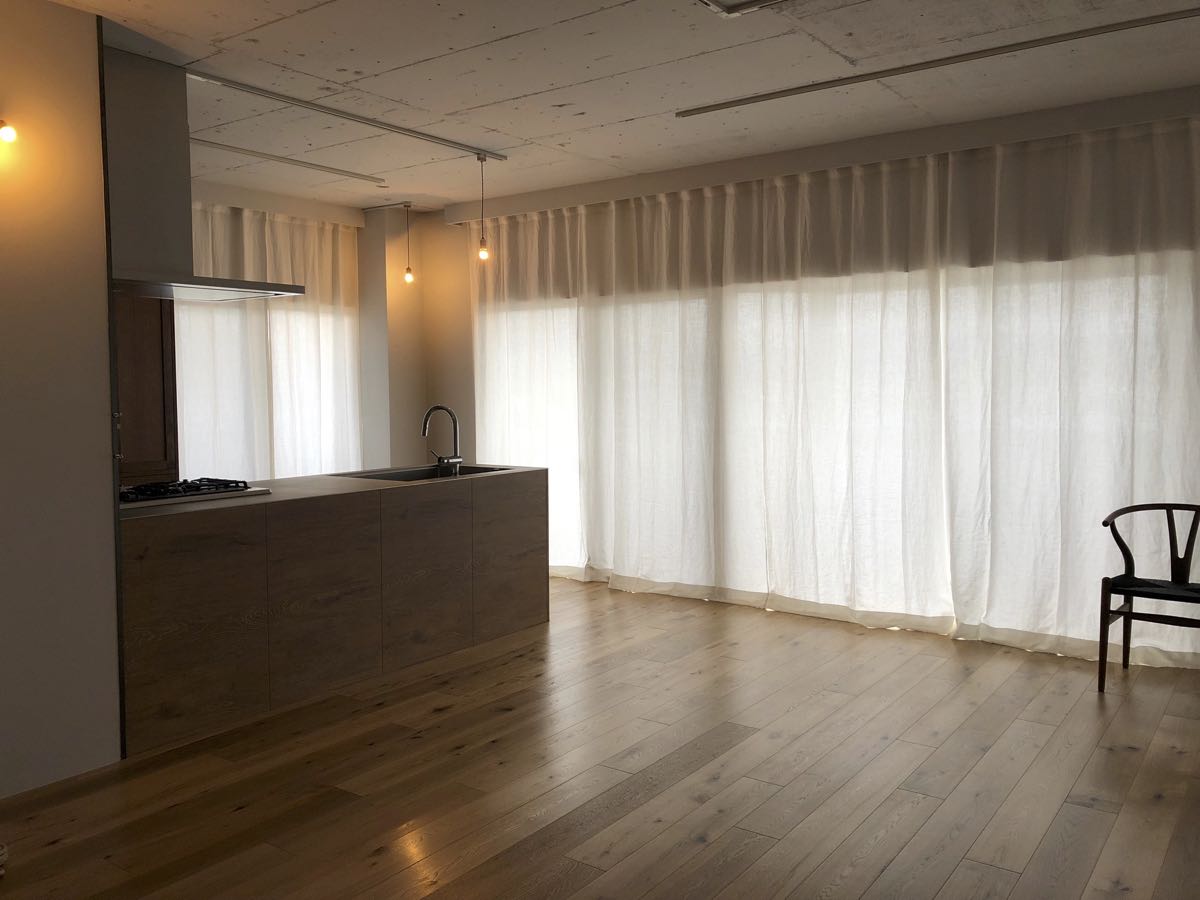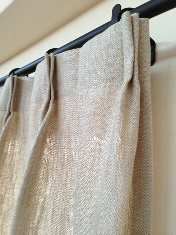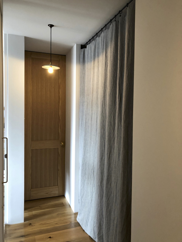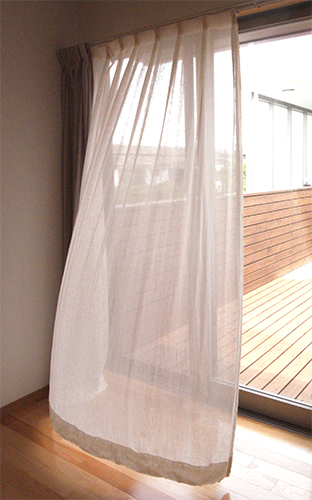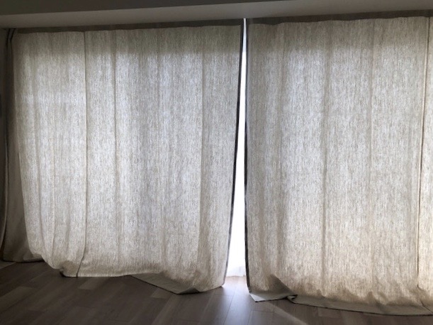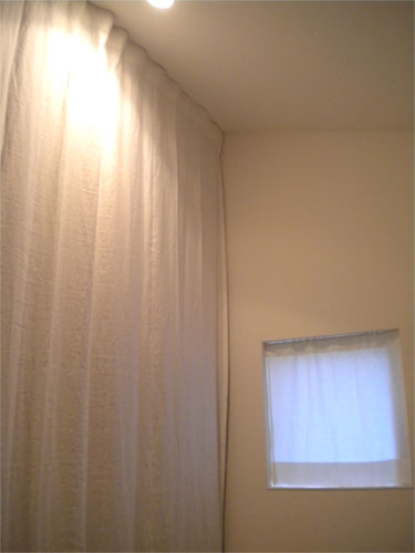 シンプルに、天井いっぱいから設置されたリネンのカーテン。プレーンの1.1倍でモダーンな空間とも程よい感じです。