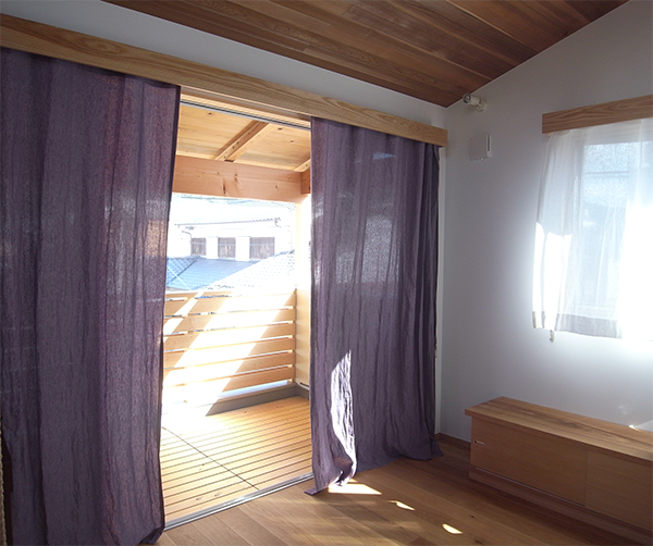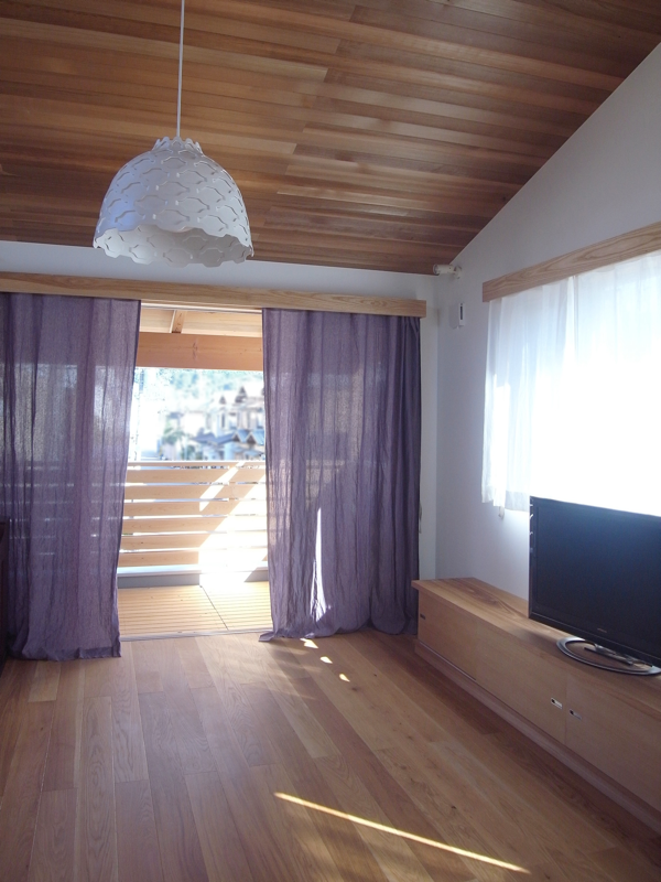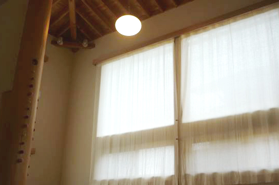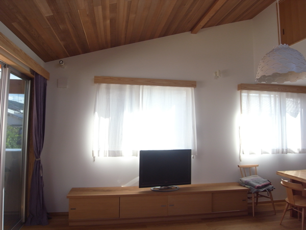 木垂木を表しにした、壁珪藻土クロス、床木フローリングのナチュラルな空間にリネンのカーテンが心地よいです。(Y邸)