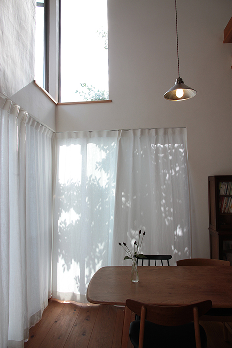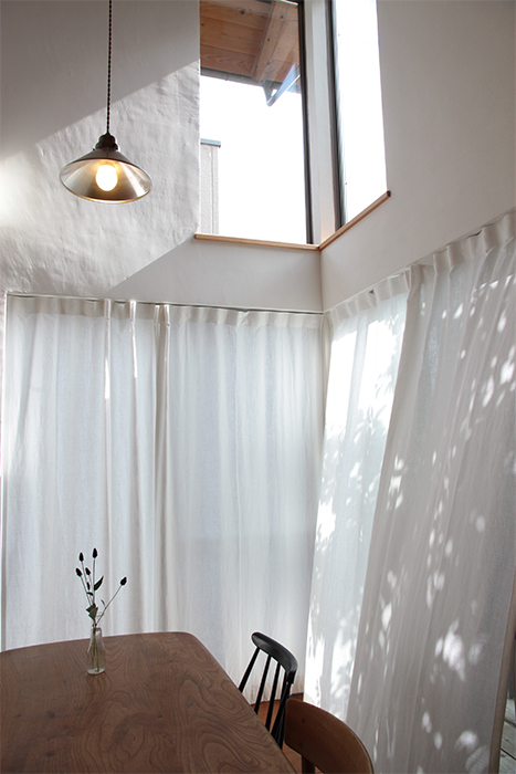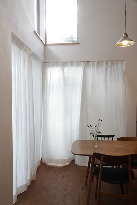 印象的な小窓に設置された、リネンのカーテン。白い壁にやわらかな表情が生まれます。