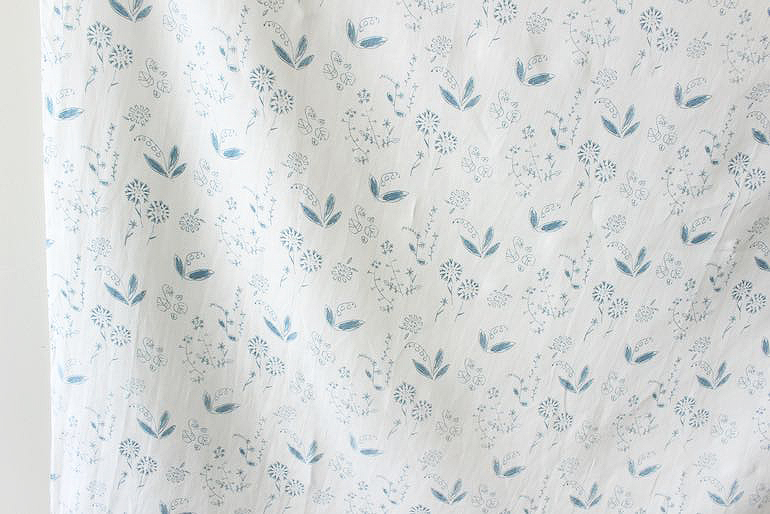 地色は、リネンの生成りベースに、群青色で花柄をナチュラルシックに。ハンドプリント技術のある京都で制作しました。