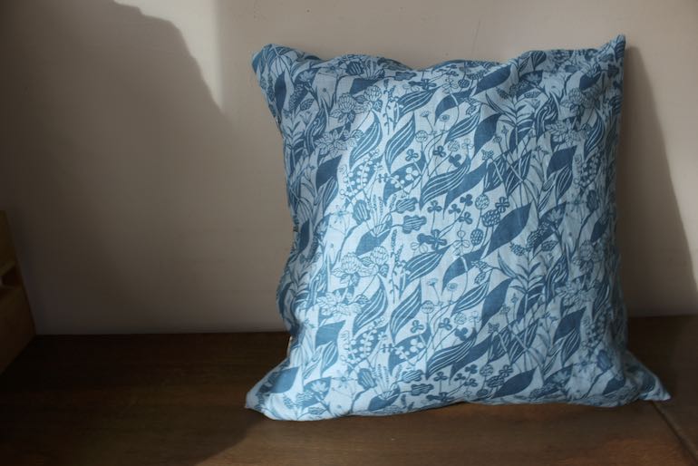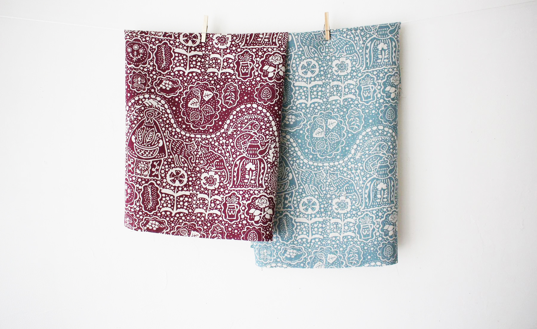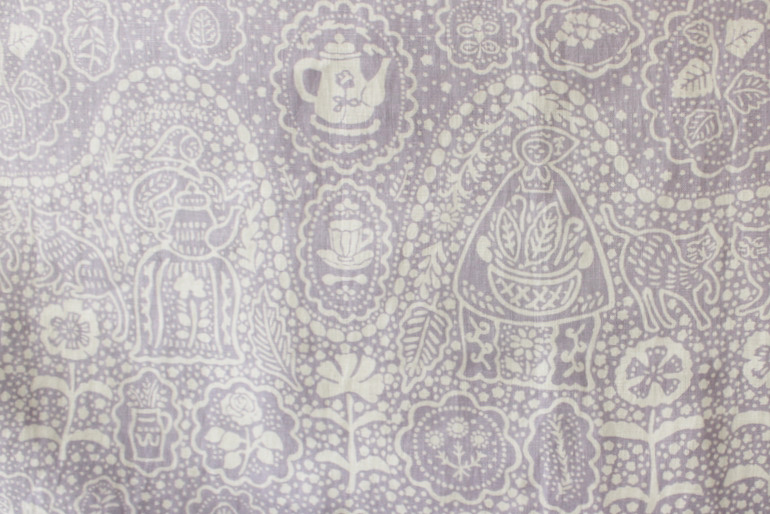 型染め作家、関美穂子さんイラストのリネンプリントです。原画を型染めで作り、それを元に、ハンドプリントで仕上げています。