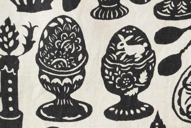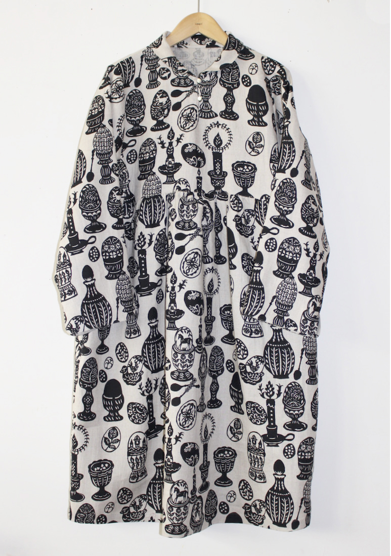 エッグスタンドに心惹かれコレクションもされているという関さんが空想されたエッグスタンドが散りばめらたリネンプリントです。ベースはリネンの生成りに、シックな黒曜石色。
