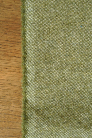 ドライな仕上がりの、リネンウールです。縦糸がリネンの生成り、緯糸のウールはピートツイードと比べると明るめの杢調のモスグリーンです。