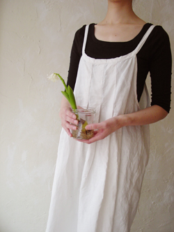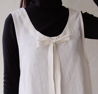 ベーシックな形のキャミソールです。前はボタンで肩ストラップの長さを調節していただけます。黒などシックな色で作るとおとなっぽく、ちょっと外に出るときにさらっとエプロンがわりにも。